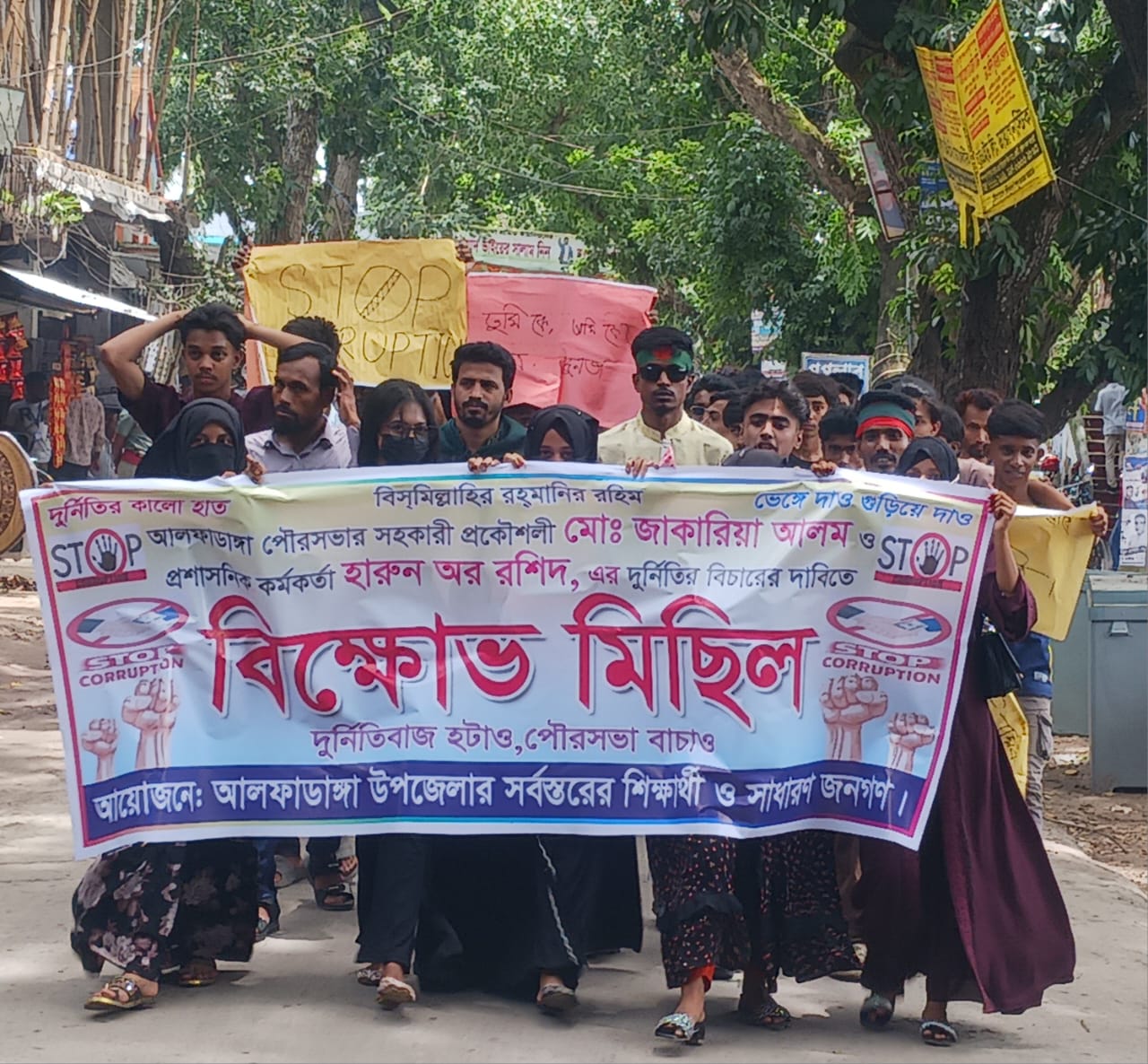 ফরিদপুরের আলফাডাঙ্গা পৌরসভার প্রকৌশলী জাকারিয়া আলম ও প্রশাসনিক কর্মকর্তা হারুন অর রশিদ এর বিরুদ্ধে বিভিন্ন অনিয়ম ও দূর্নীতির অভিযোগে বিক্ষোভ মিছিল করেছে বিক্ষুব্ধ ছাত্রজনতা। বুধবার ২৫ জুন বেলা ১২ টায় বিক্ষোভ মিছিল টি সদর বাজারের প্রধান প্রধান সড়ক প্রদর্শন করে পৌর সভা কার্যালয়ের সামনে সমাবেশ করেন। সমাবেশে বক্তব্য রাখেন প্রাইভেট বিশ্ববিদ্যালয়ের ছাত্র প্রতিনিধি জুবায়ের হোসেন রবিন, রায়হান রনি ও এম এফ আরিফ।